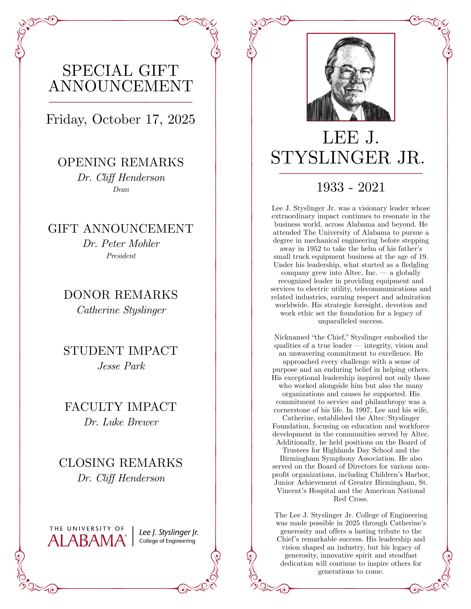 Designed the program for the renaming of the Styslinger College of Engineering at The University of Alabama. Included biography of Lee J. Styslinger Jr and outline of speakers for the event.
